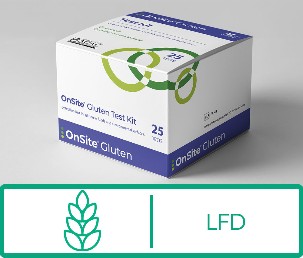 The OnSite® Gluten test kit is designed to detect gluten from wheat, barley, and rye in a variety of baked and raw foods and on environmental surfaces.